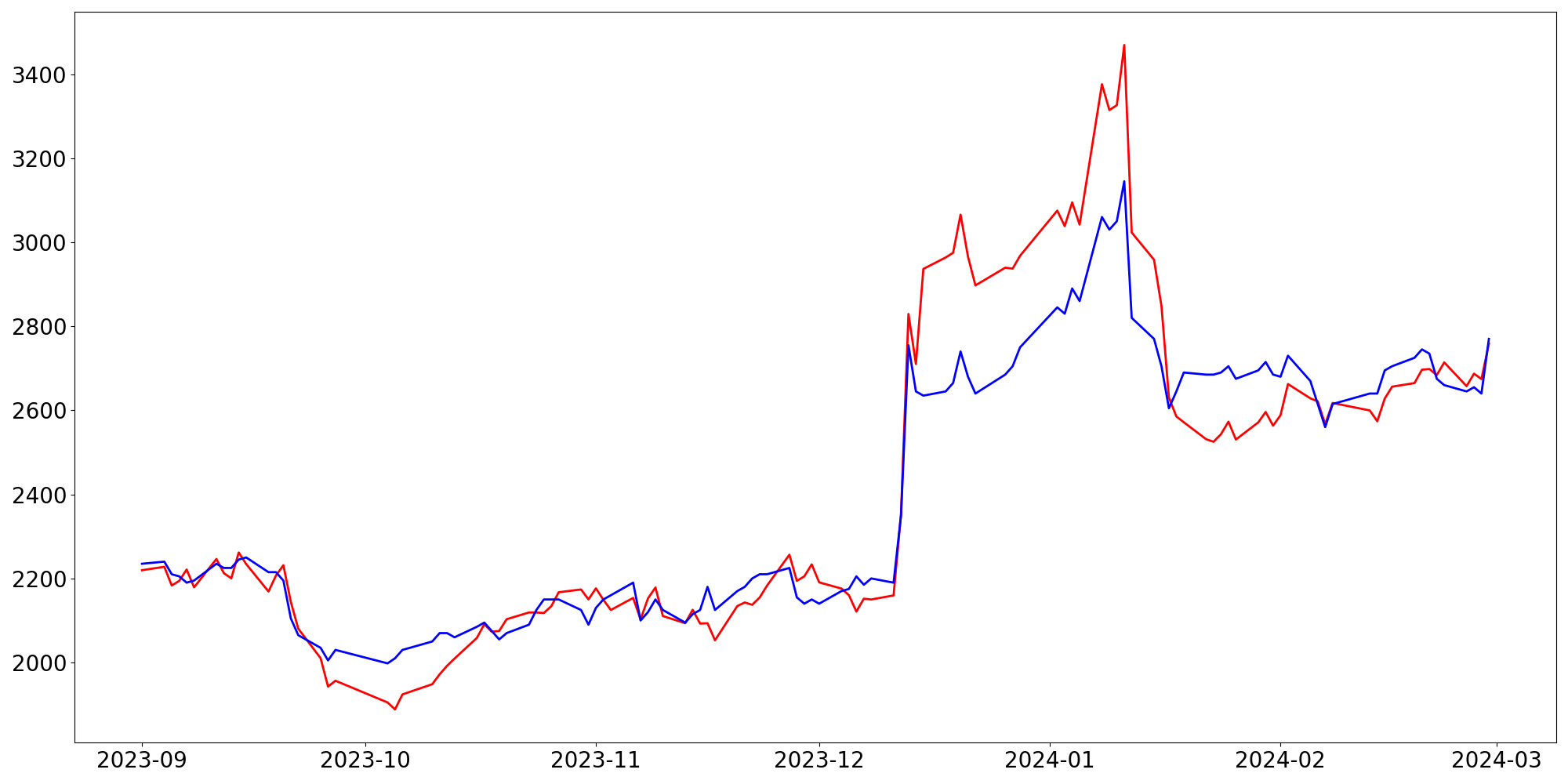 [ - : 실제값(종가) / - : 예측값(종가) ]