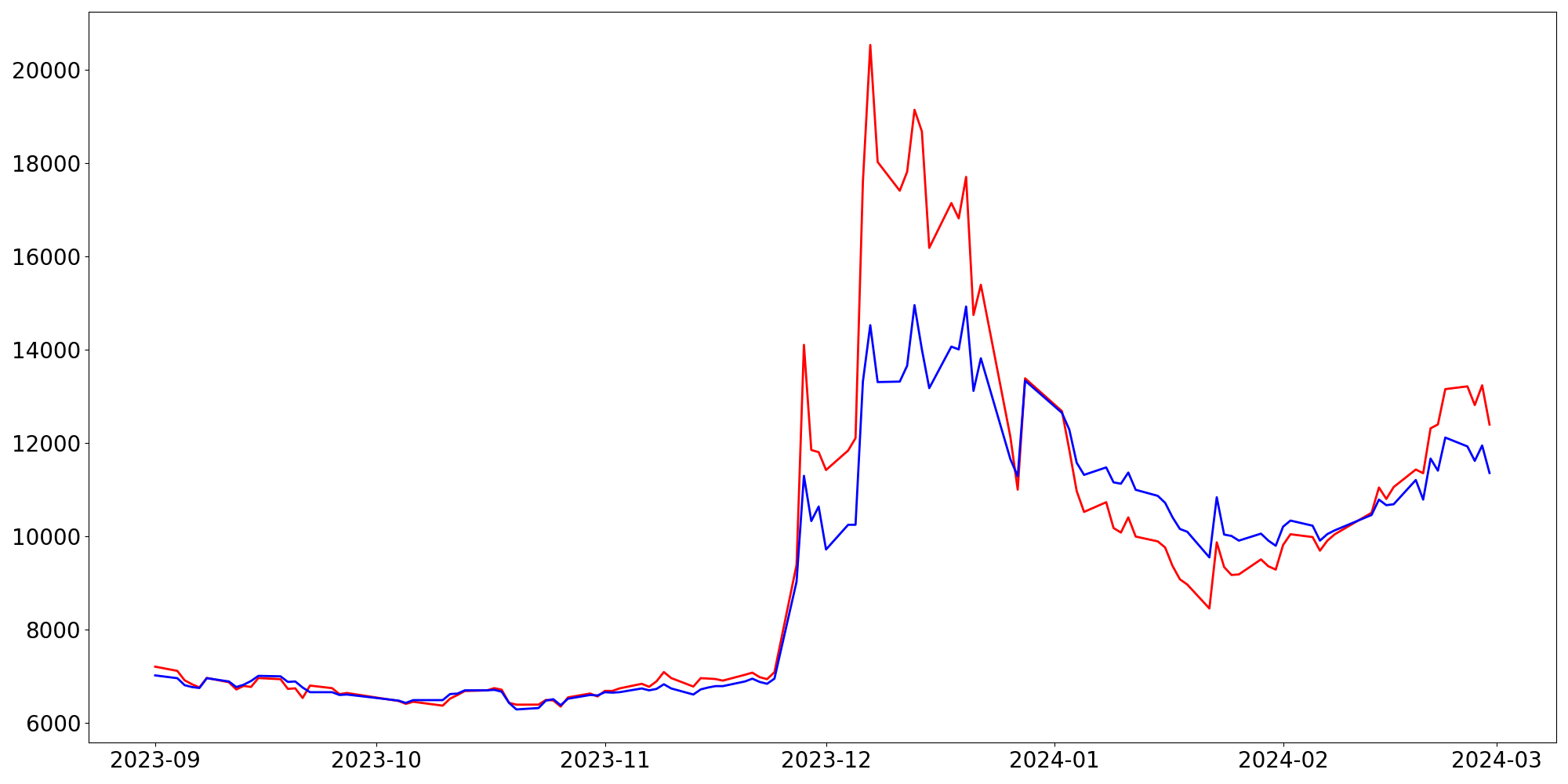 [ - : 실제값(종가) / - : 예측값(종가) ]