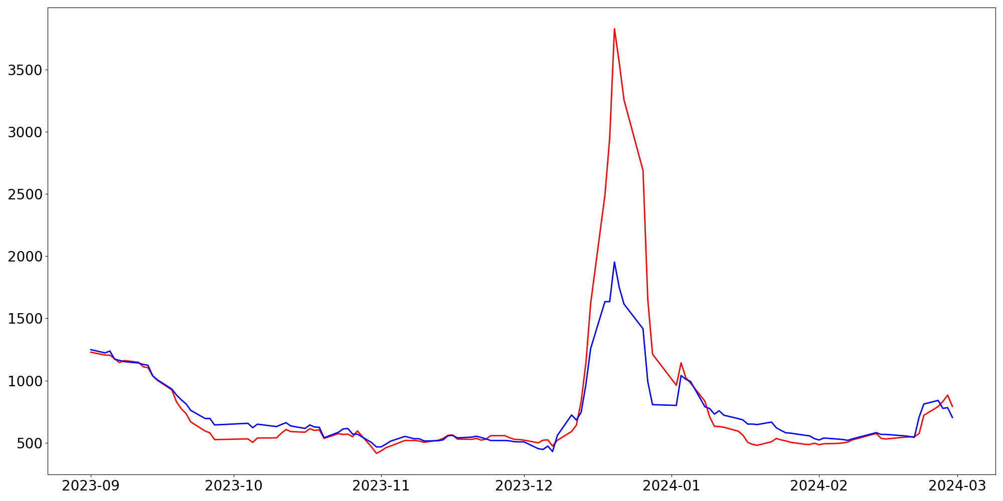 [ - : 실제값(종가) / - : 예측값(종가) ]