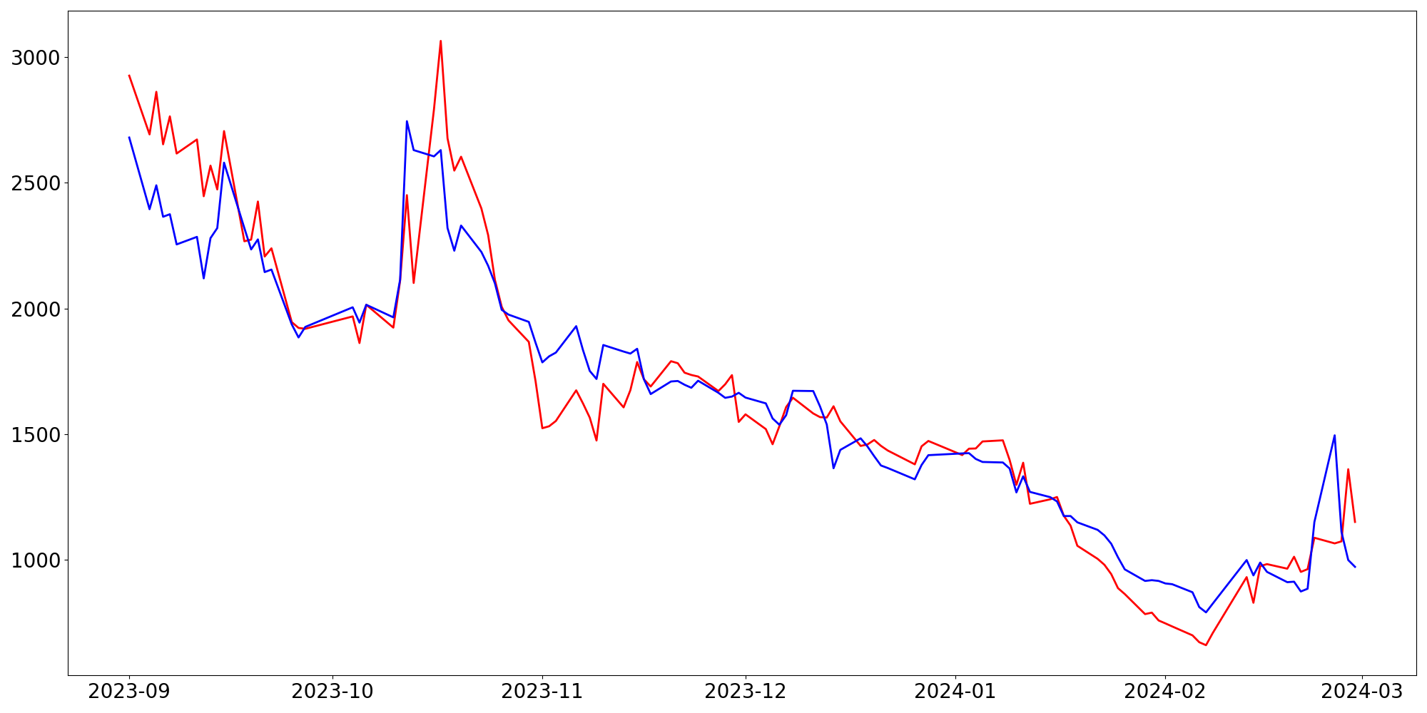 [ - : 실제값(종가) / - : 예측값(종가) ]