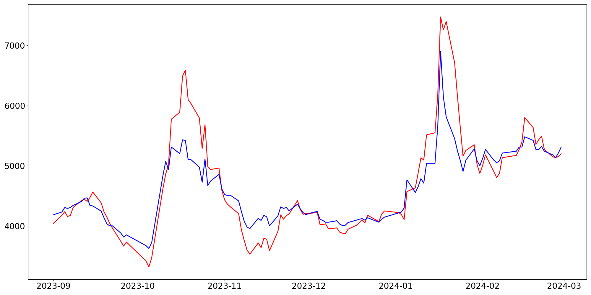 [ - : 실제값(종가) / - : 예측값(종가) ]