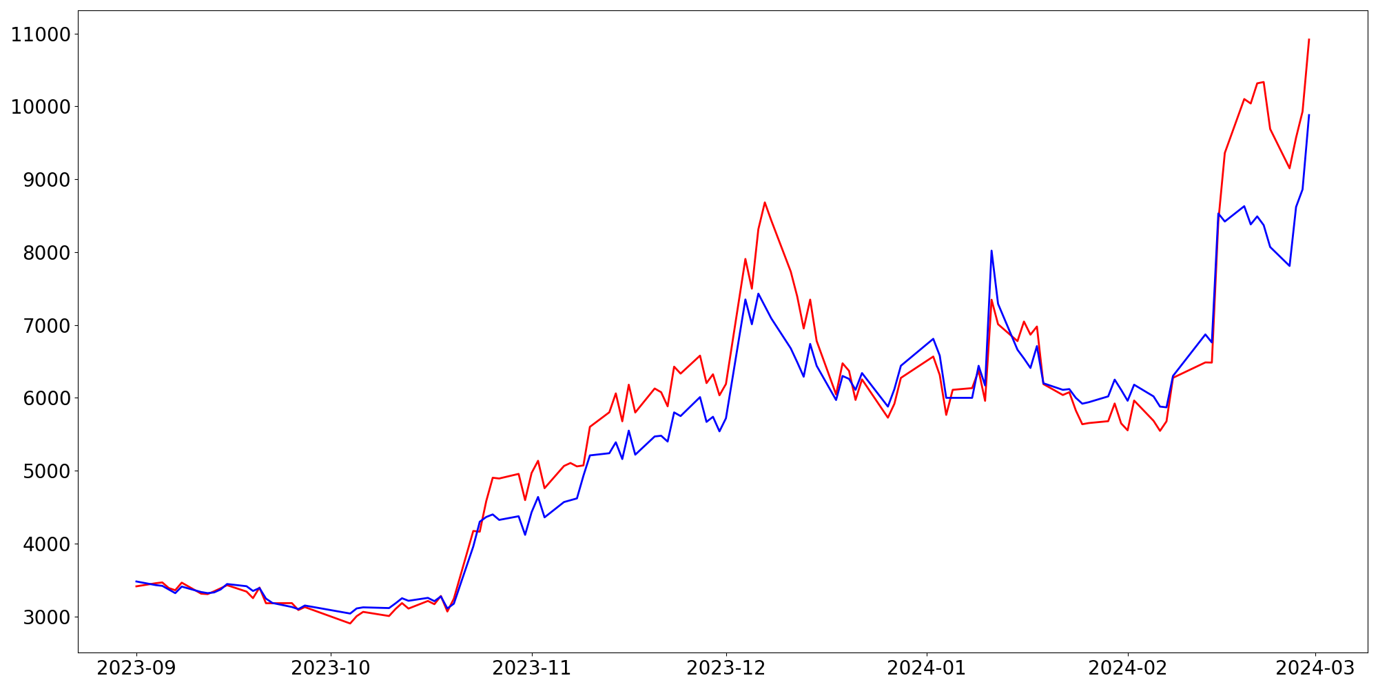 [ - : 실제값(종가) / - : 예측값(종가) ]
