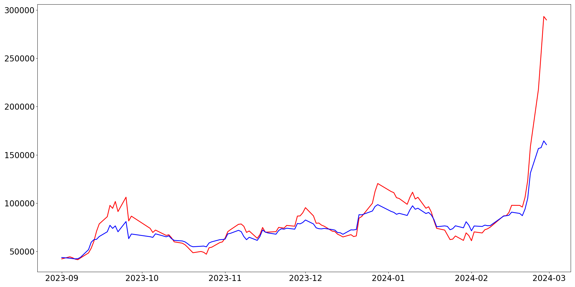 [ - : 실제값(종가) / - : 예측값(종가) ]