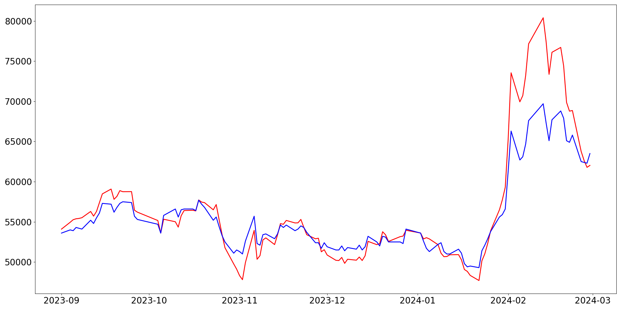 [ - : 실제값(종가) / - : 예측값(종가) ]