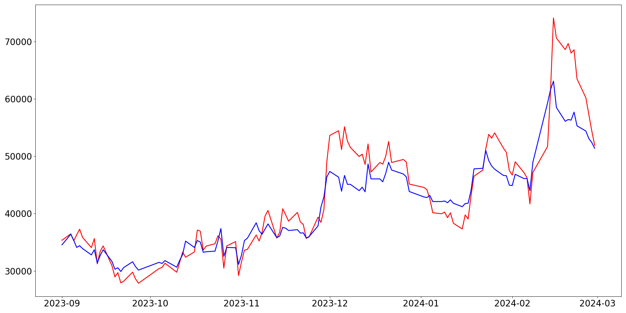 [ - : 실제값(종가) / - : 예측값(종가) ]