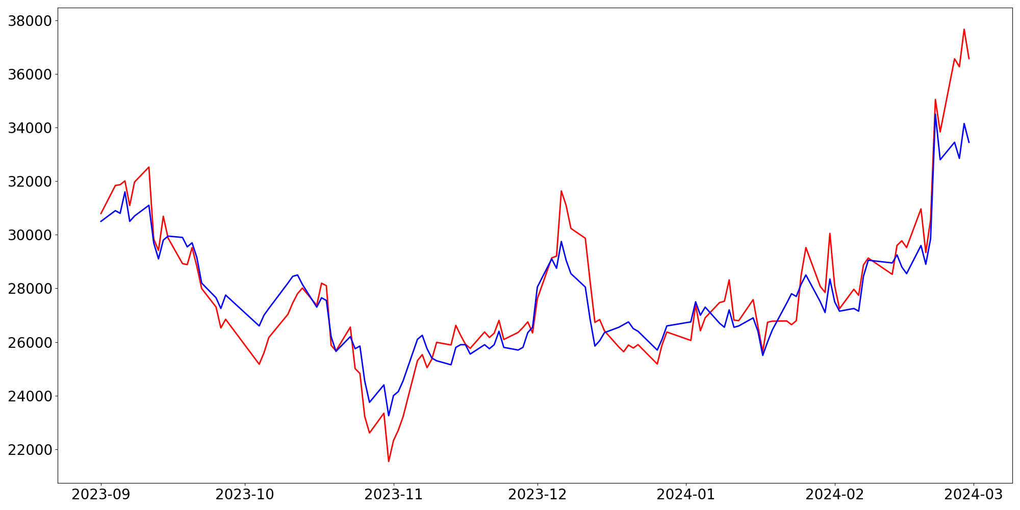 [ - : 실제값(종가) / - : 예측값(종가) ]