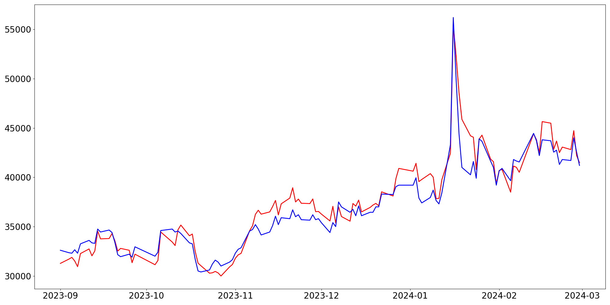 [ - : 실제값(종가) / - : 예측값(종가) ]