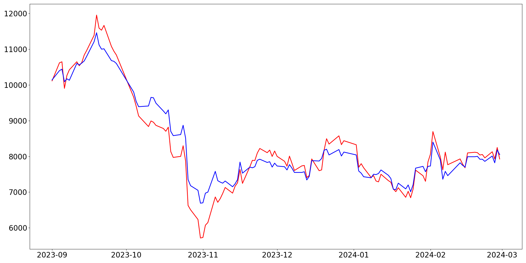 [ - : 실제값(종가) / - : 예측값(종가) ]