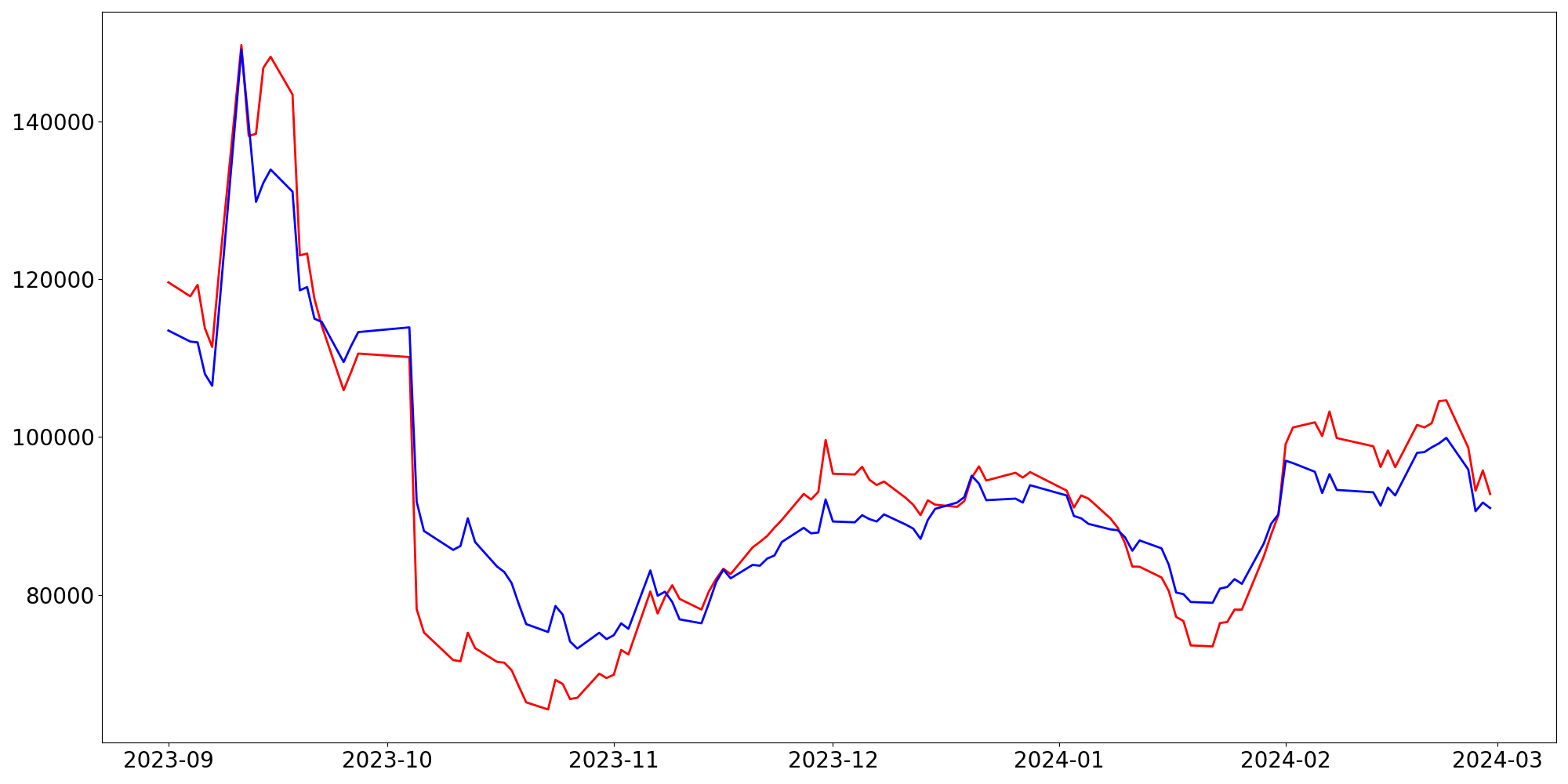 [ - : 실제값(종가) / - : 예측값(종가) ]
