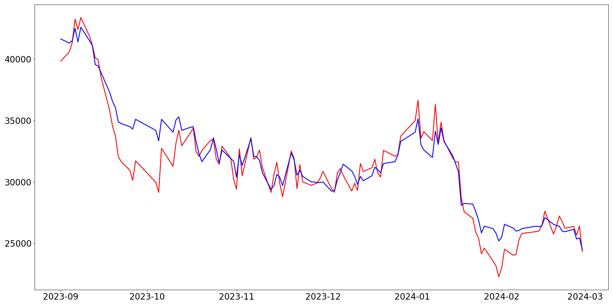 [ - : 실제값(종가) / - : 예측값(종가) ]