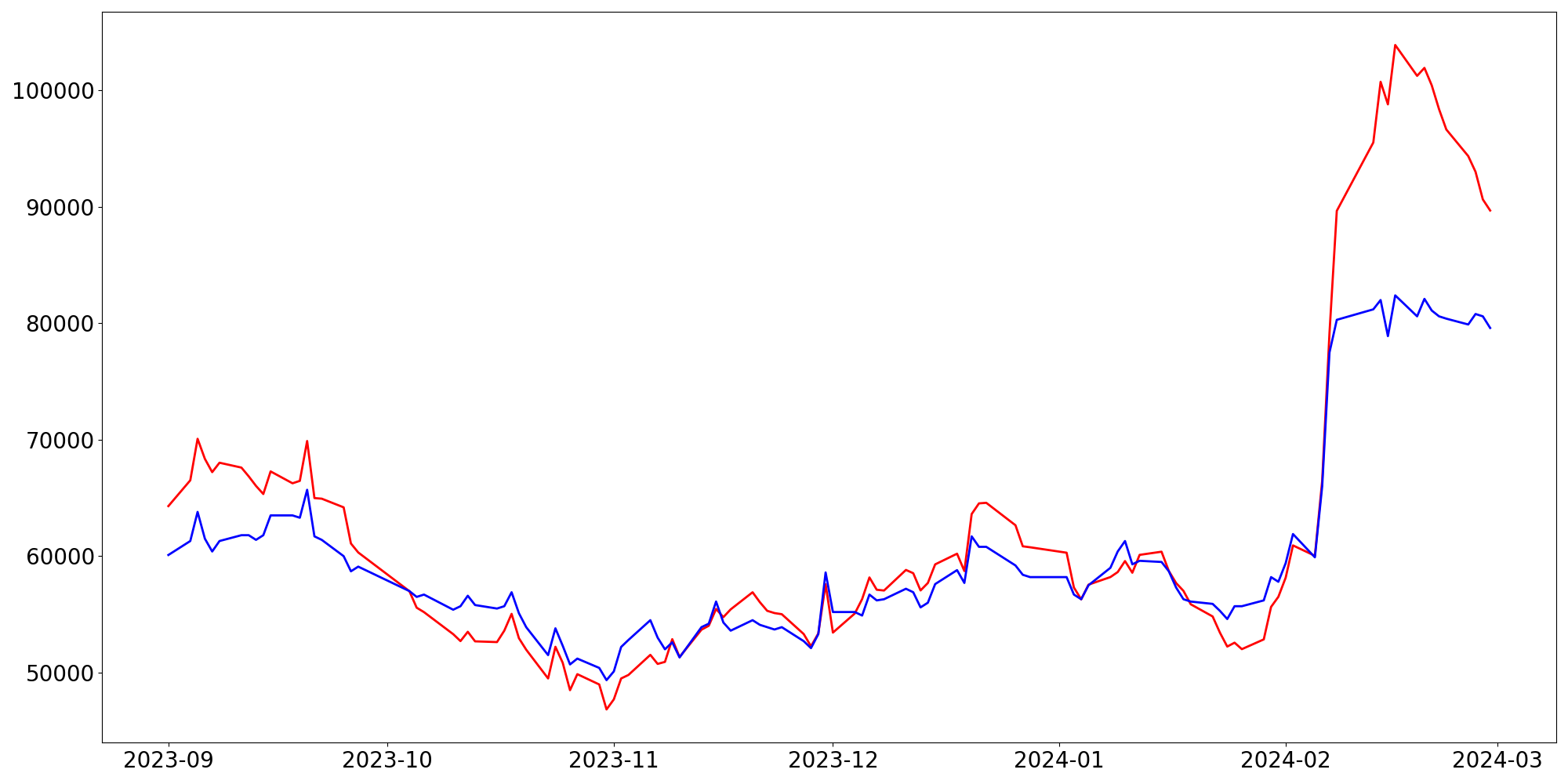 [ - : 실제값(종가) / - : 예측값(종가) ]