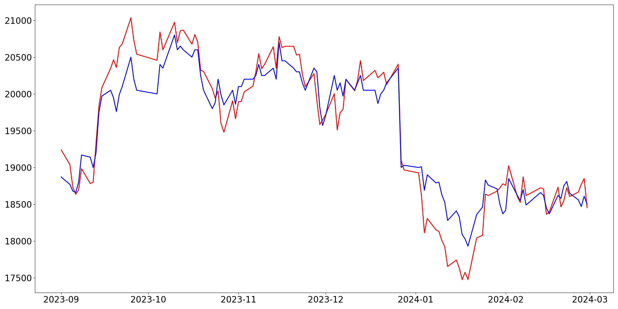[ - : 실제값(종가) / - : 예측값(종가) ]