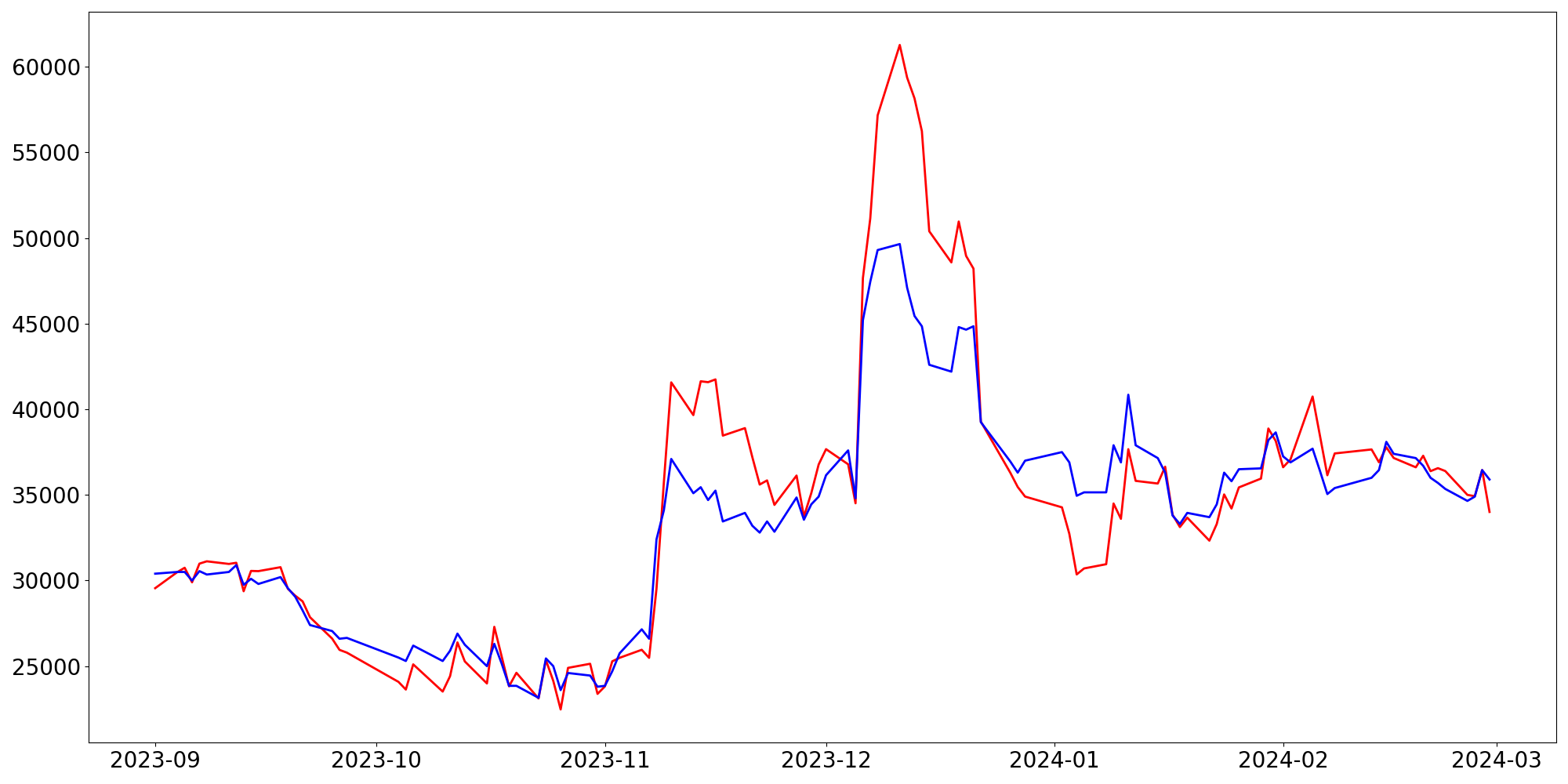 [ - : 실제값(종가) / - : 예측값(종가) ]