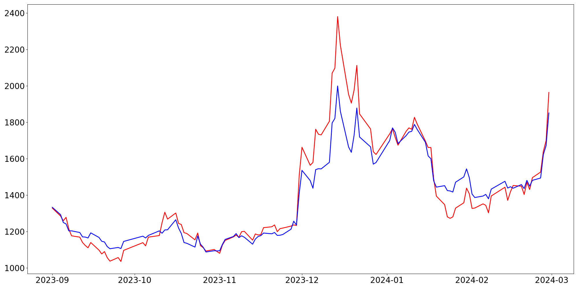 [ - : 실제값(종가) / - : 예측값(종가) ]