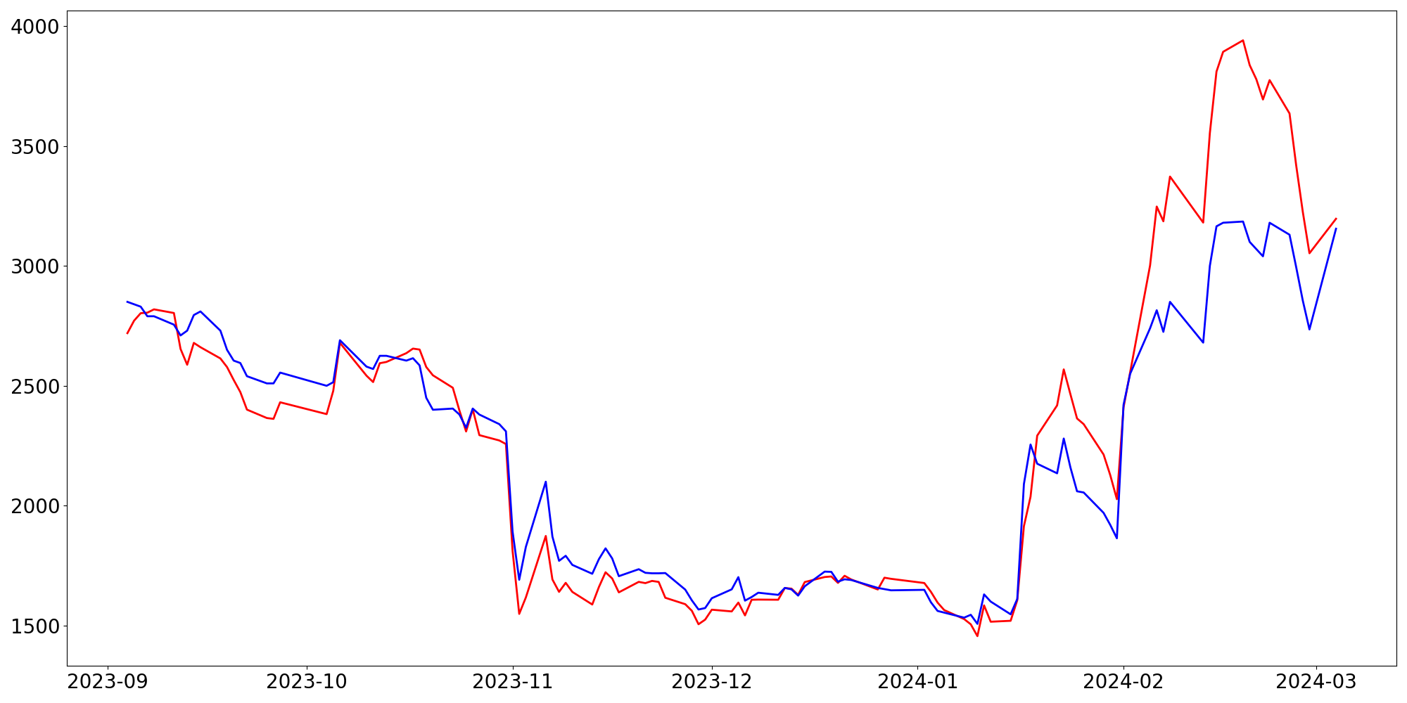 [ - : 실제값(종가) / - : 예측값(종가) ]
