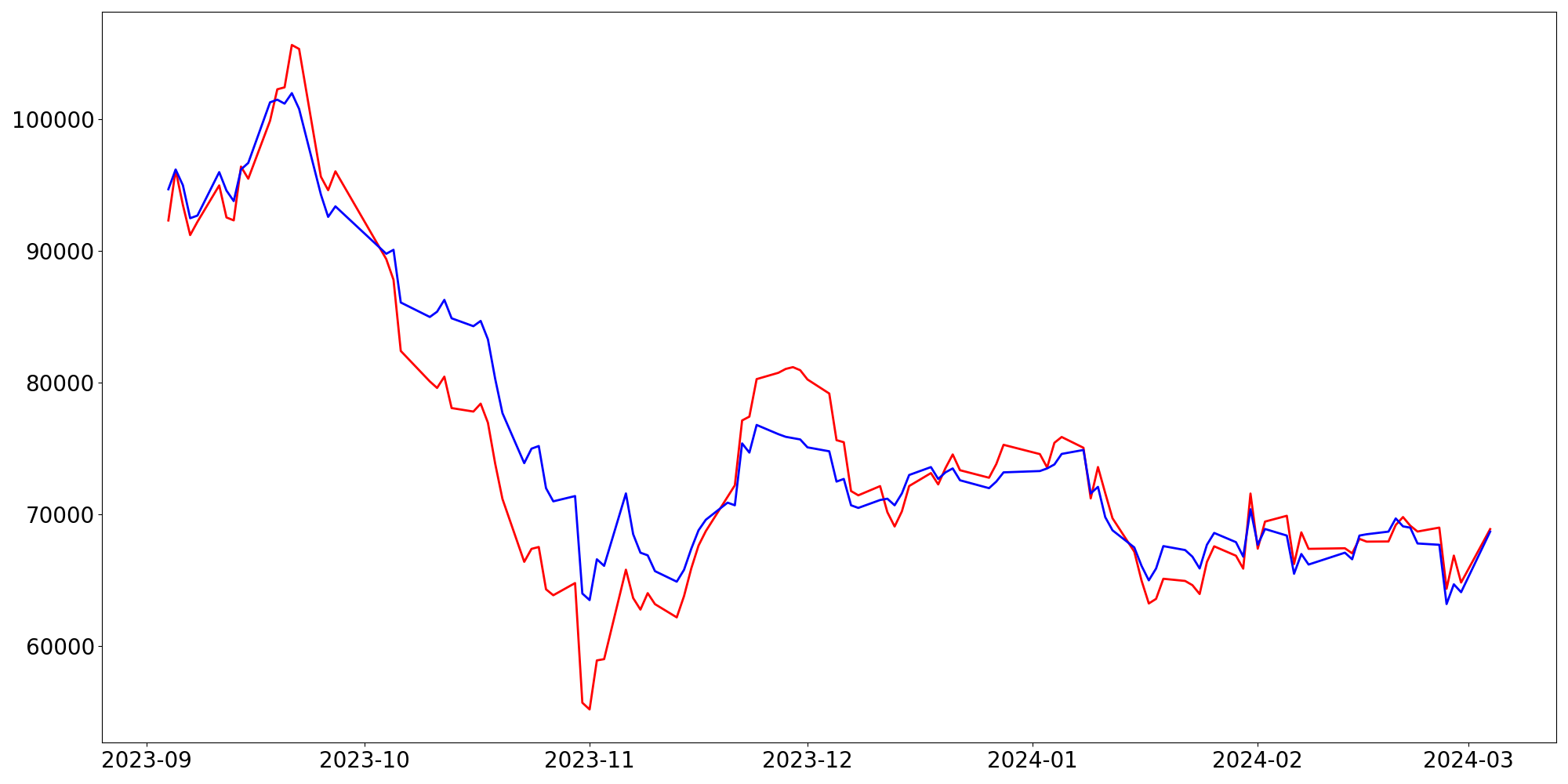 [ - : 실제값(종가) / - : 예측값(종가) ]