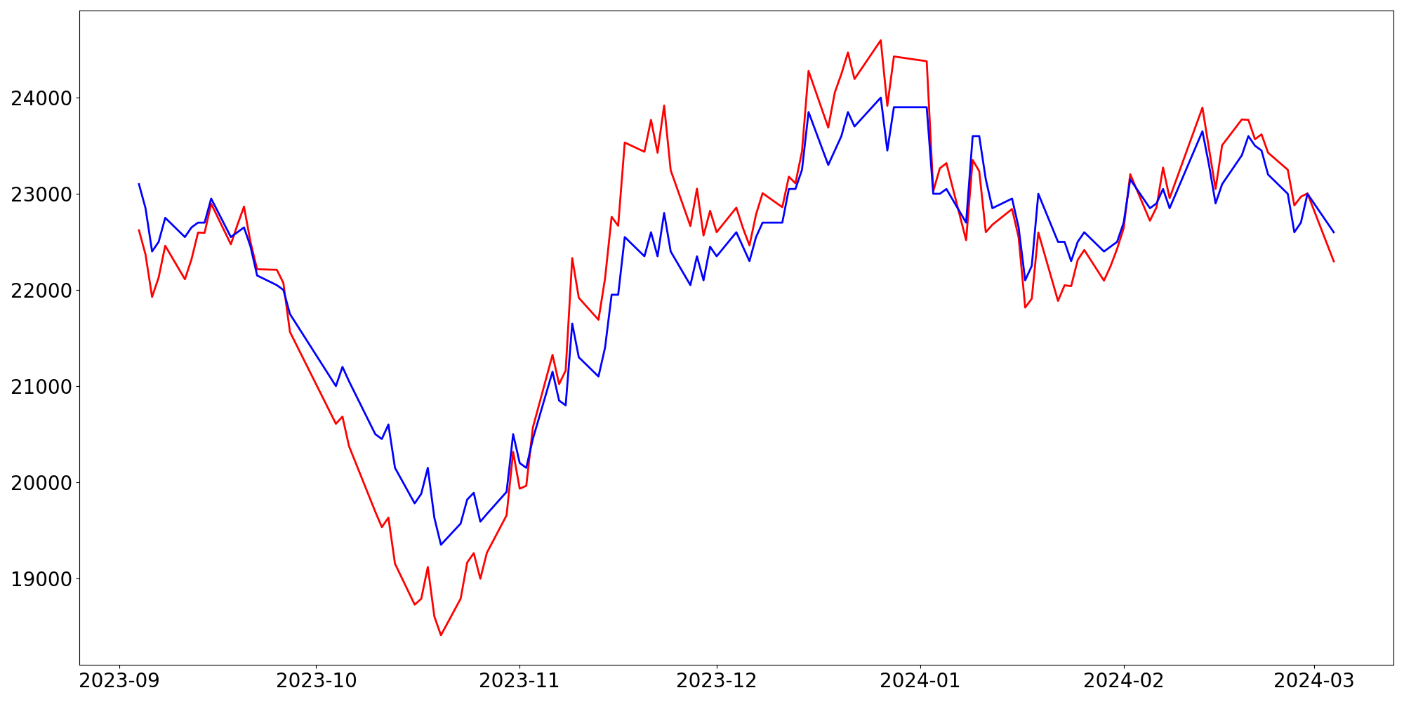 [ - : 실제값(종가) / - : 예측값(종가) ]