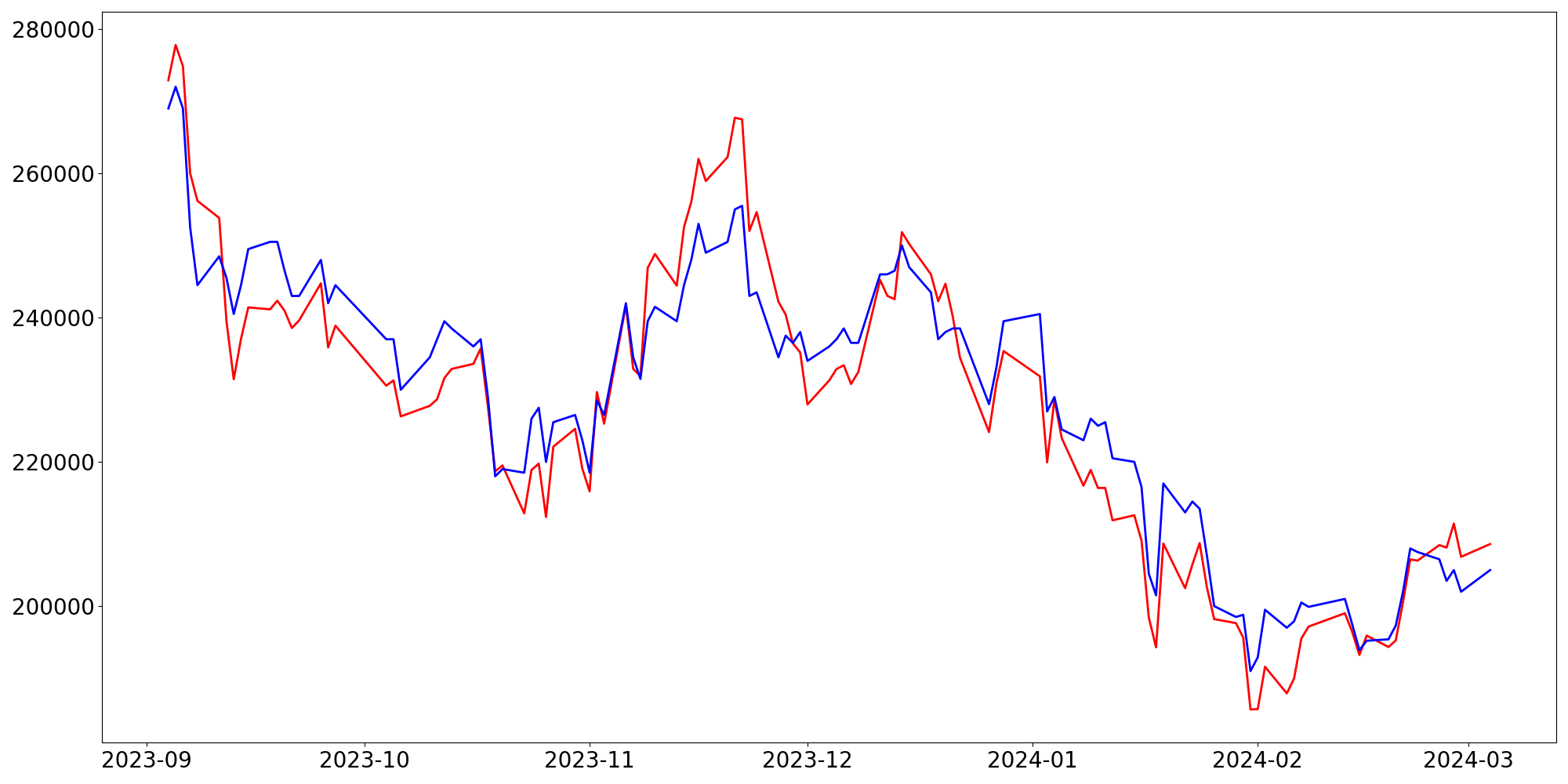 [ - : 실제값(종가) / - : 예측값(종가) ]