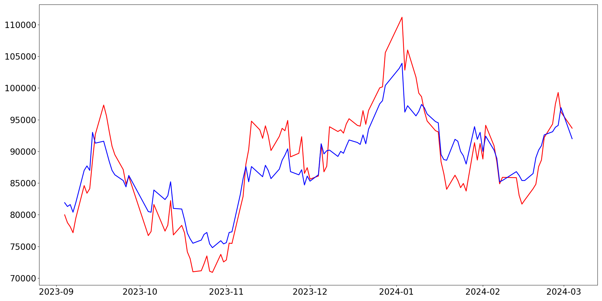 [ - : 실제값(종가) / - : 예측값(종가) ]