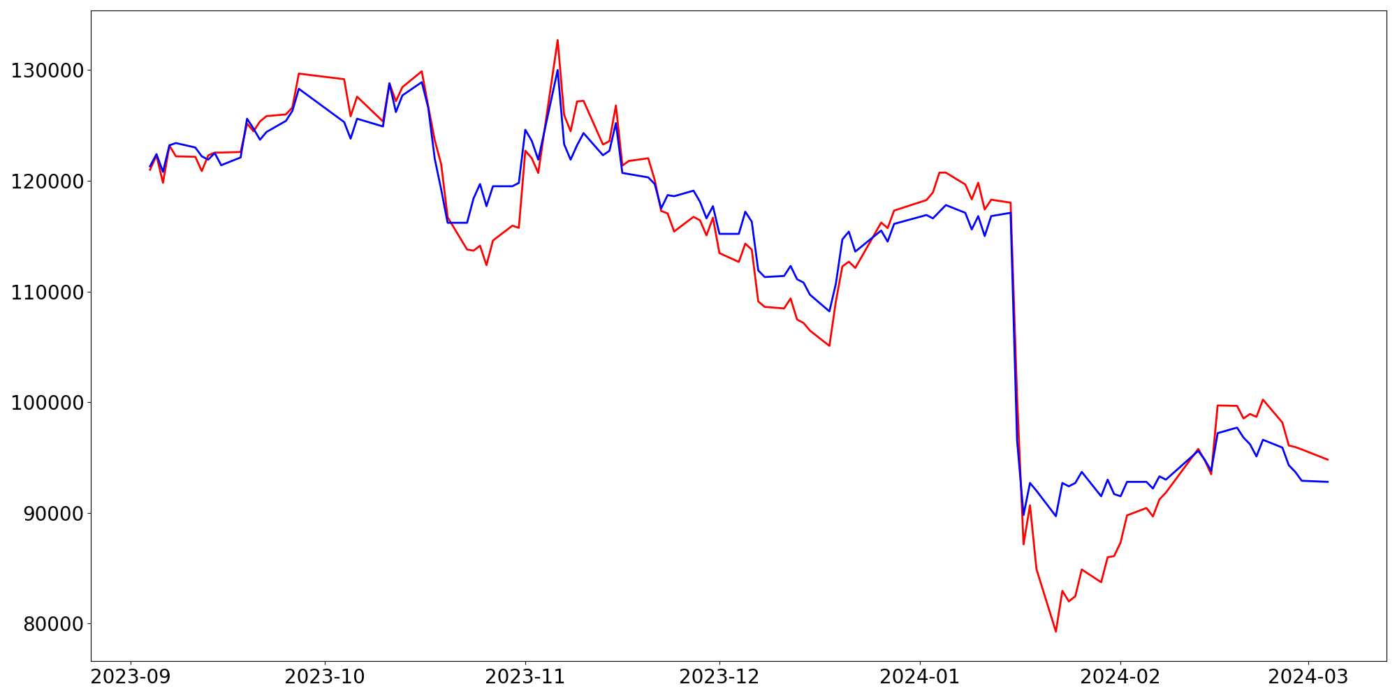 [ - : 실제값(종가) / - : 예측값(종가) ]