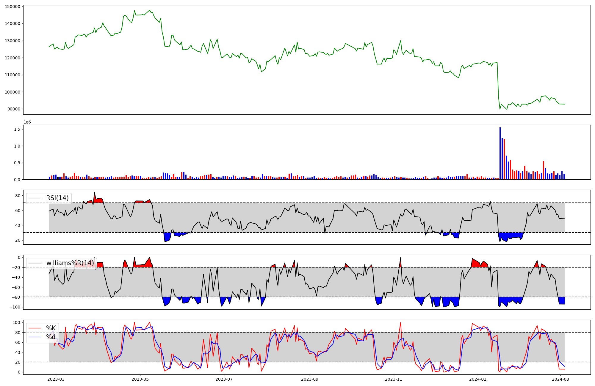 □ 중기 : 현재 종가가 중기(60일) 이동평균값(103,338원)을 하회 하여 중기적 추세 하락 중