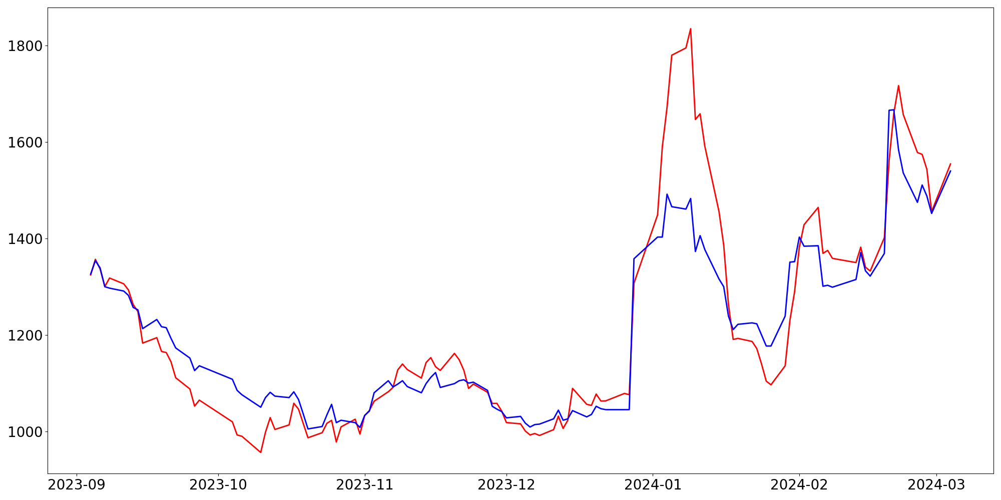 [ - : 실제값(종가) / - : 예측값(종가) ]