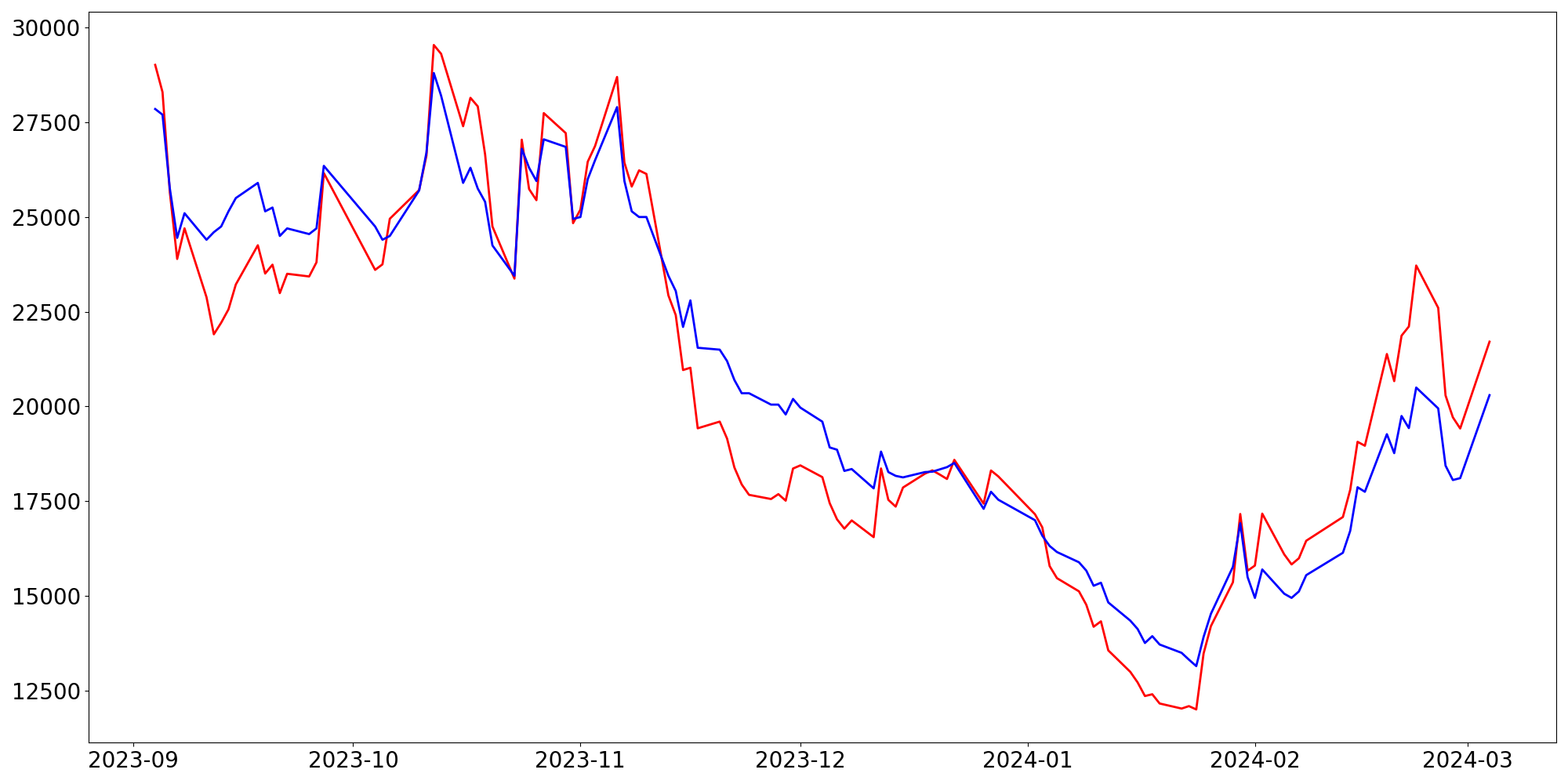 [ - : 실제값(종가) / - : 예측값(종가) ]