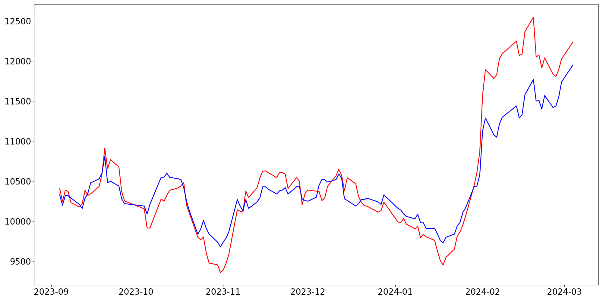 [ - : 실제값(종가) / - : 예측값(종가) ]