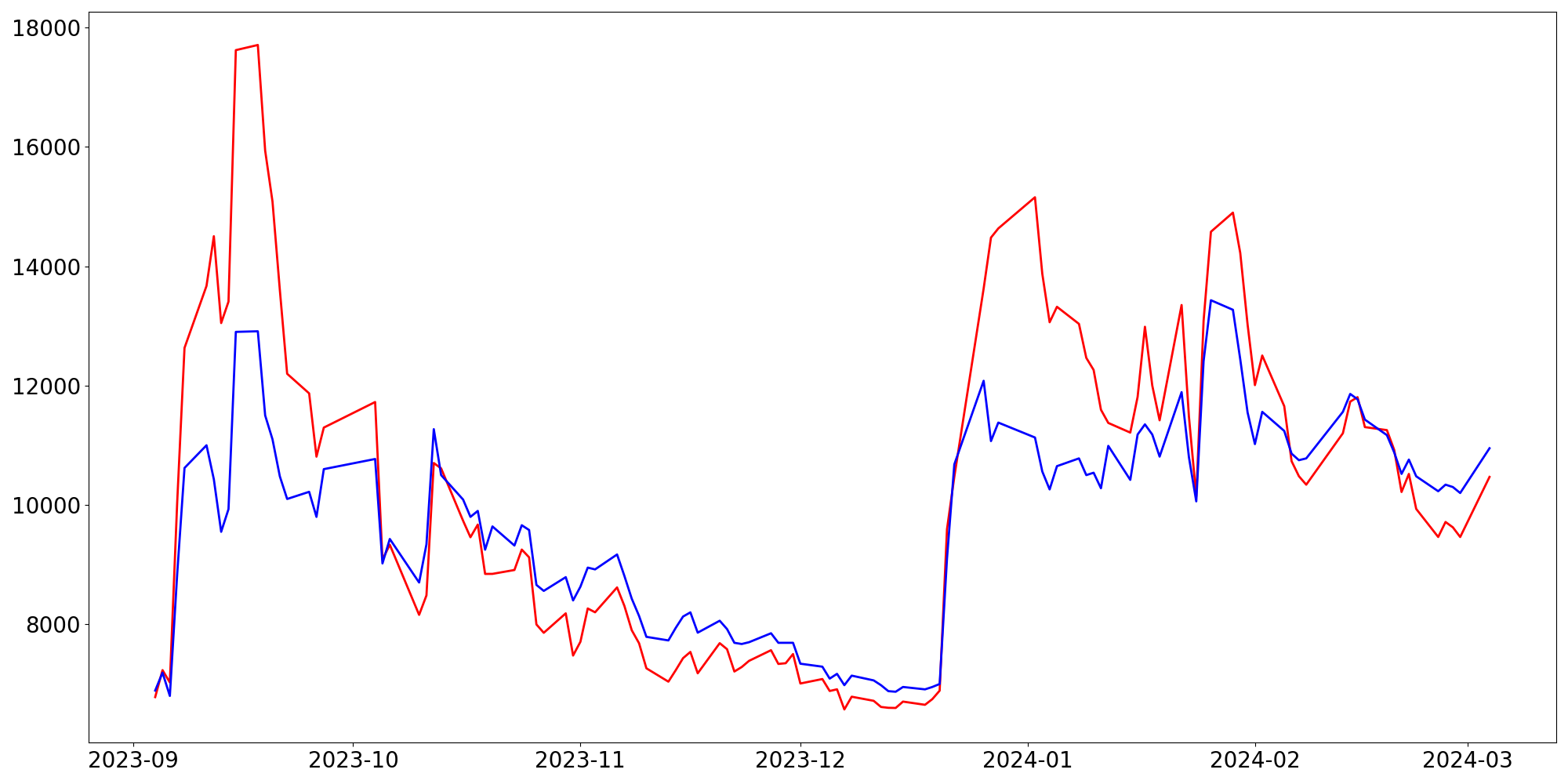 [ - : 실제값(종가) / - : 예측값(종가) ]