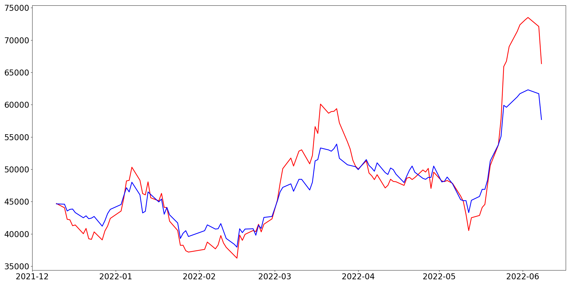 [ - : 실제값(종가) / - : 예측값(종가) ]