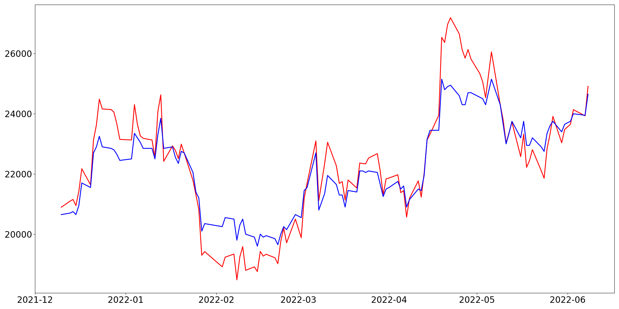 [ - : 실제값(종가) / - : 예측값(종가) ]