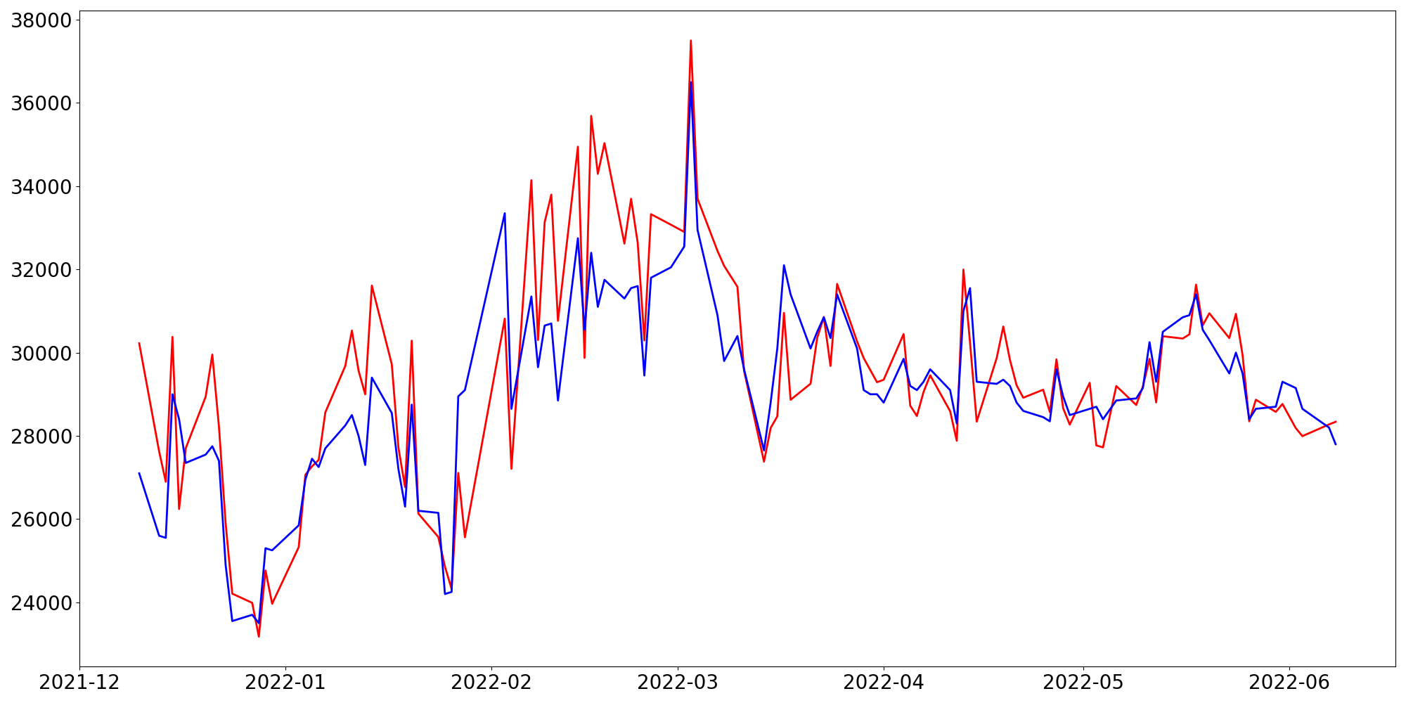 [ - : 실제값(종가) / - : 예측값(종가) ]