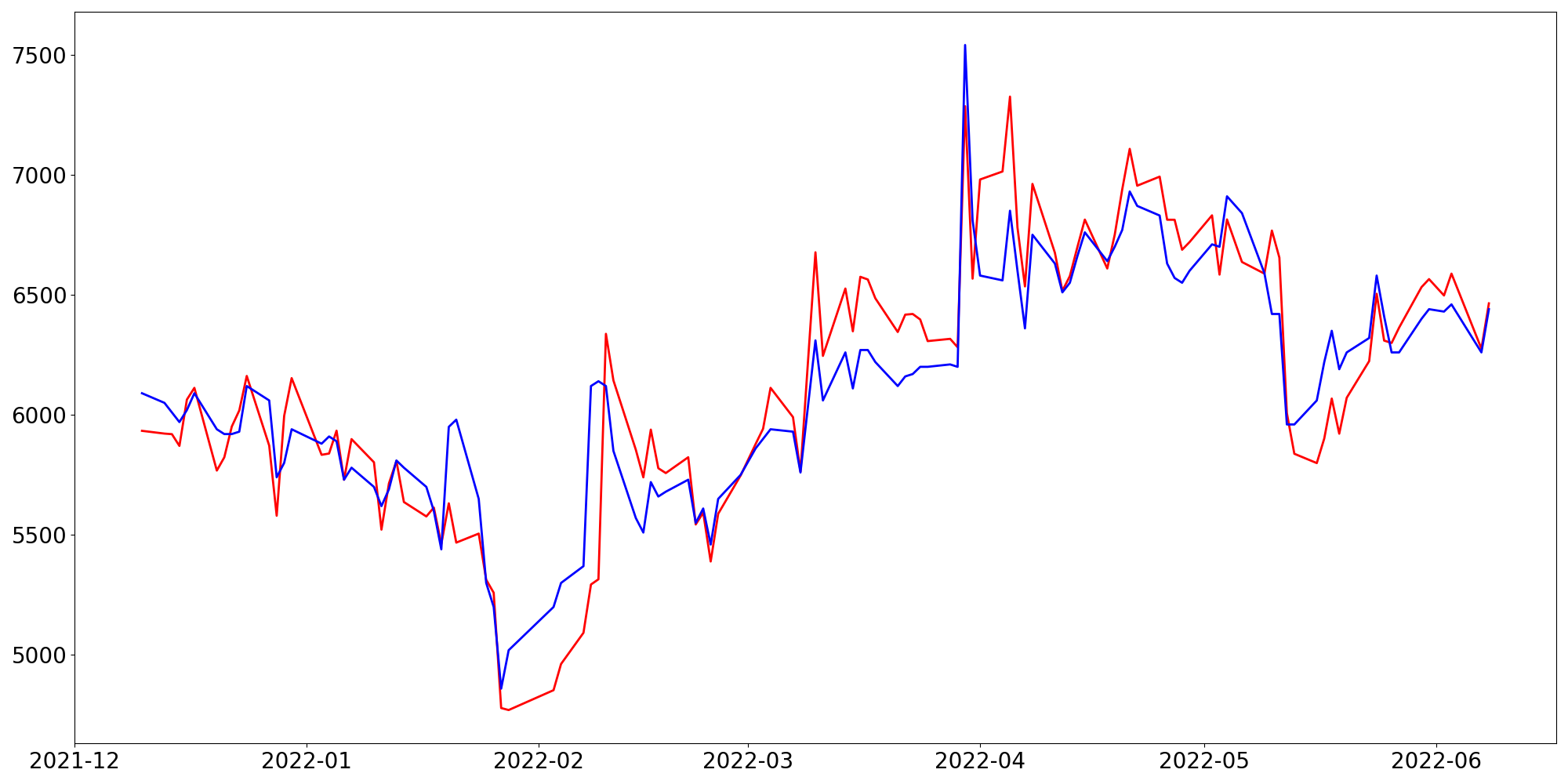 [ - : 실제값(종가) / - : 예측값(종가) ]