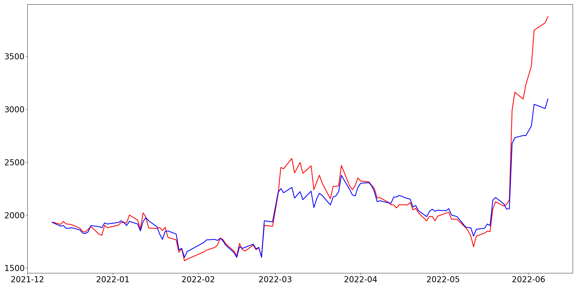 [ - : 실제값(종가) / - : 예측값(종가) ]