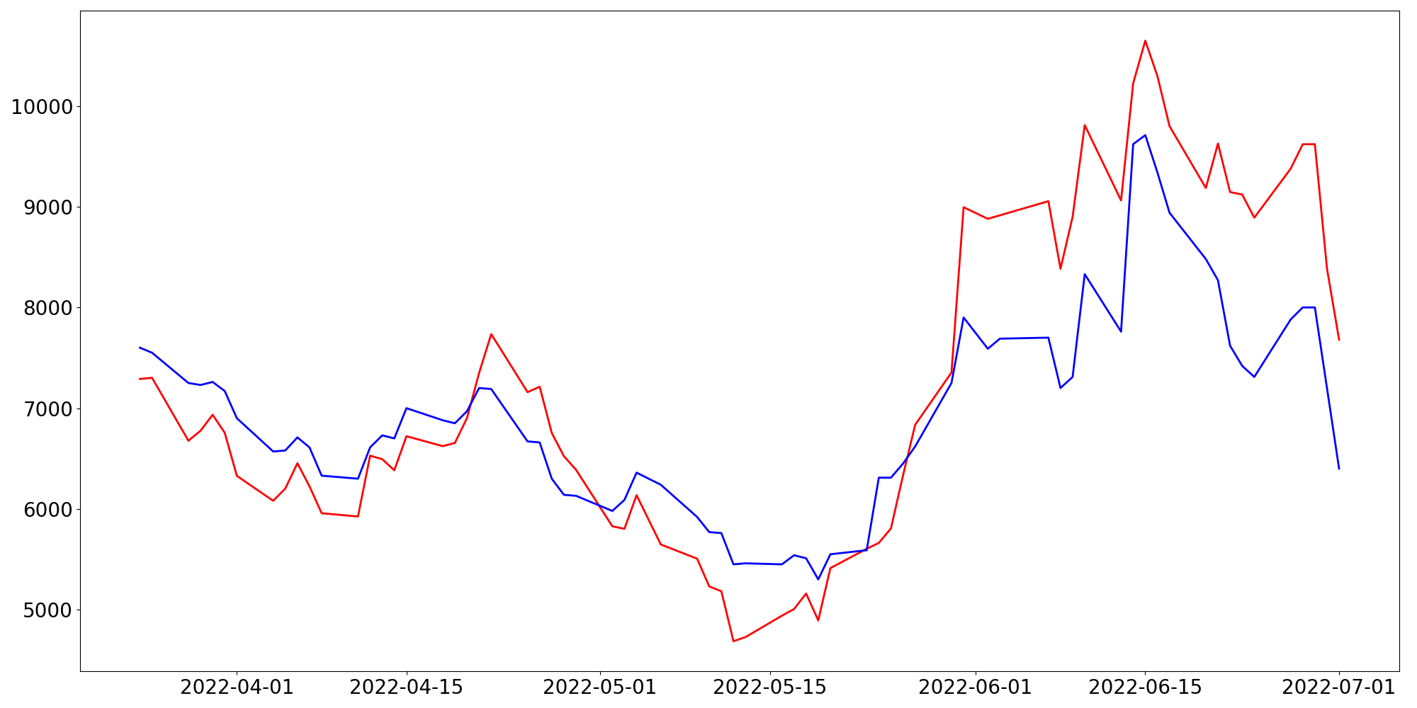 [ - : 실제값(종가) / - : 예측값(종가) ]