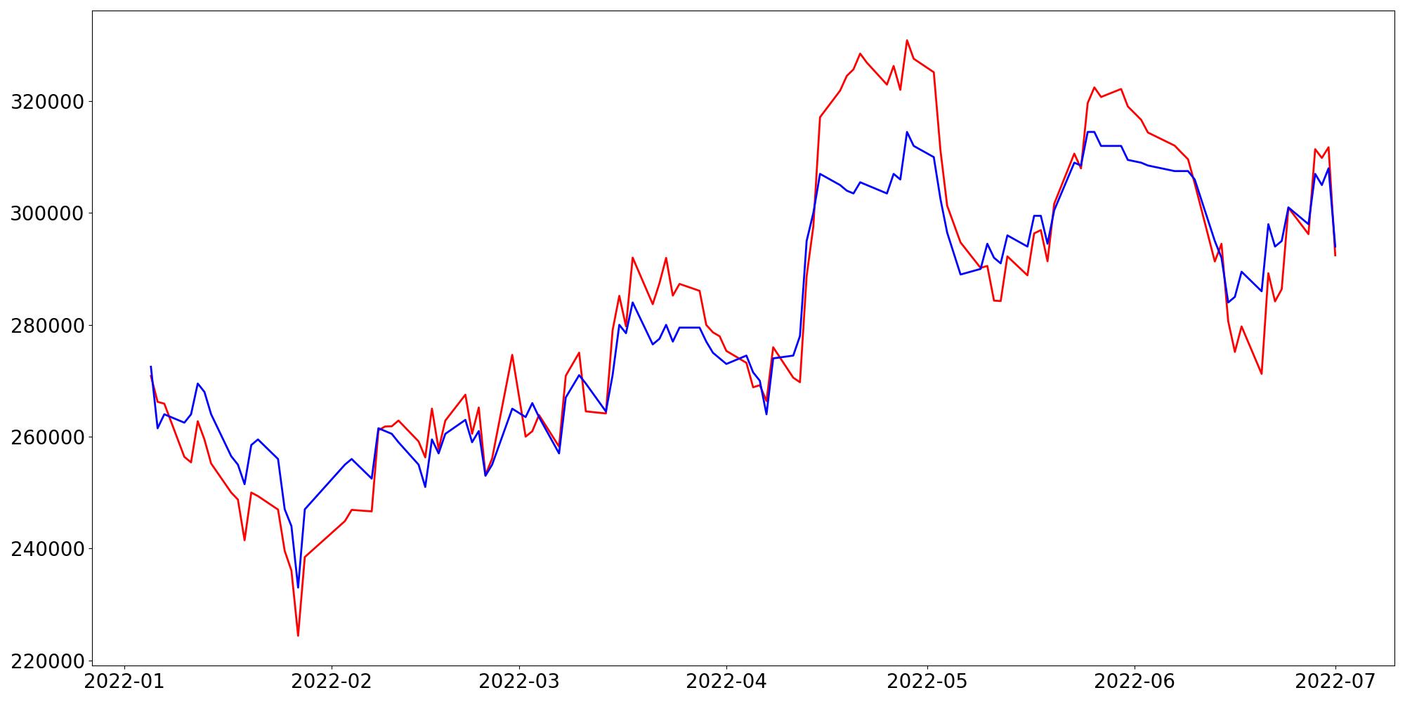 [ - : 실제값(종가) / - : 예측값(종가) ]