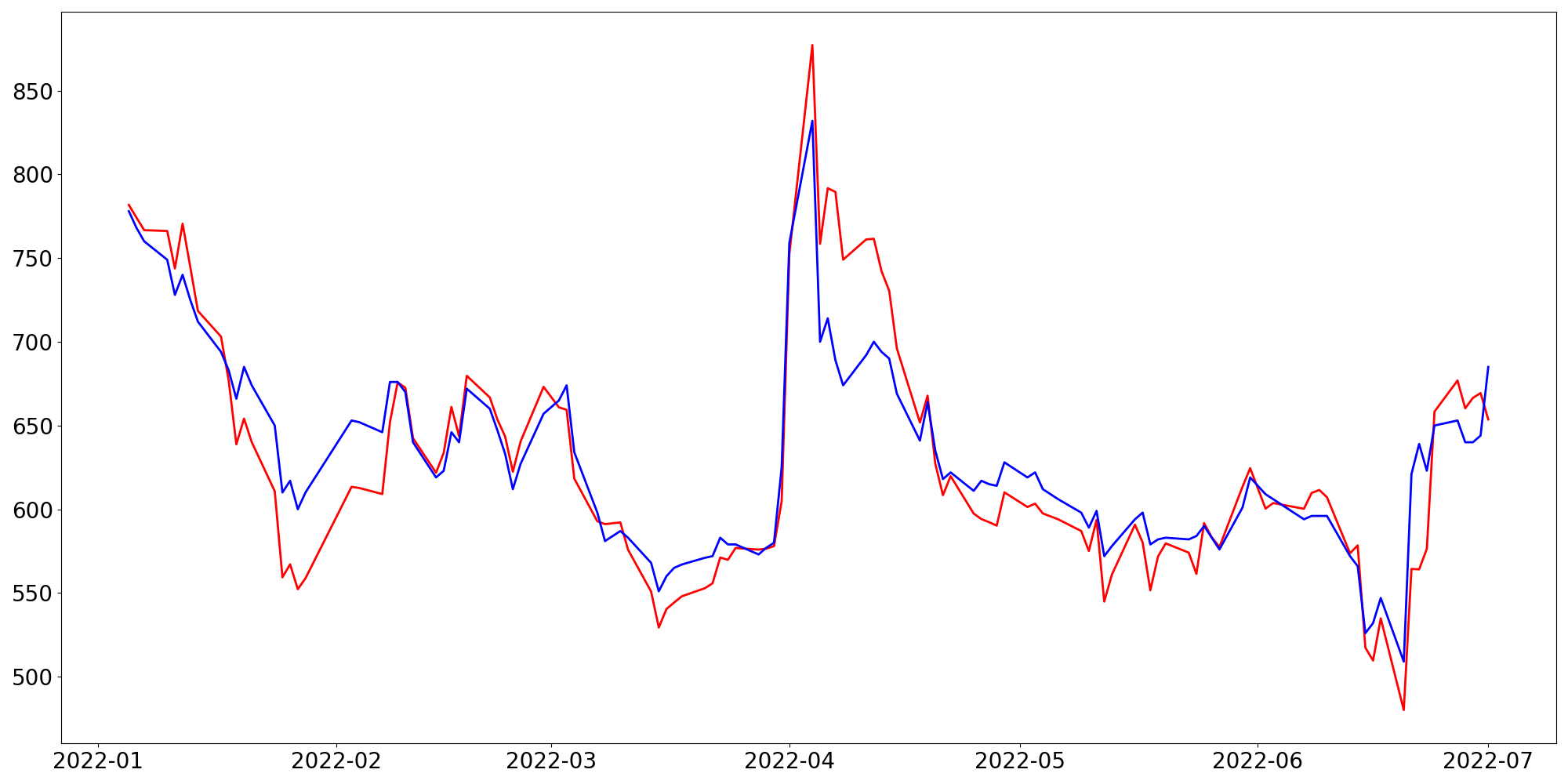 [ - : 실제값(종가) / - : 예측값(종가) ]