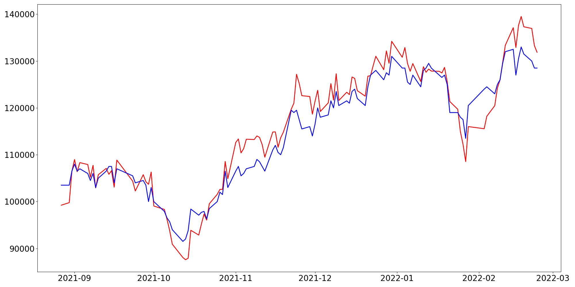 [ - : 실제값(종가) / - : 예측값(종가) ]