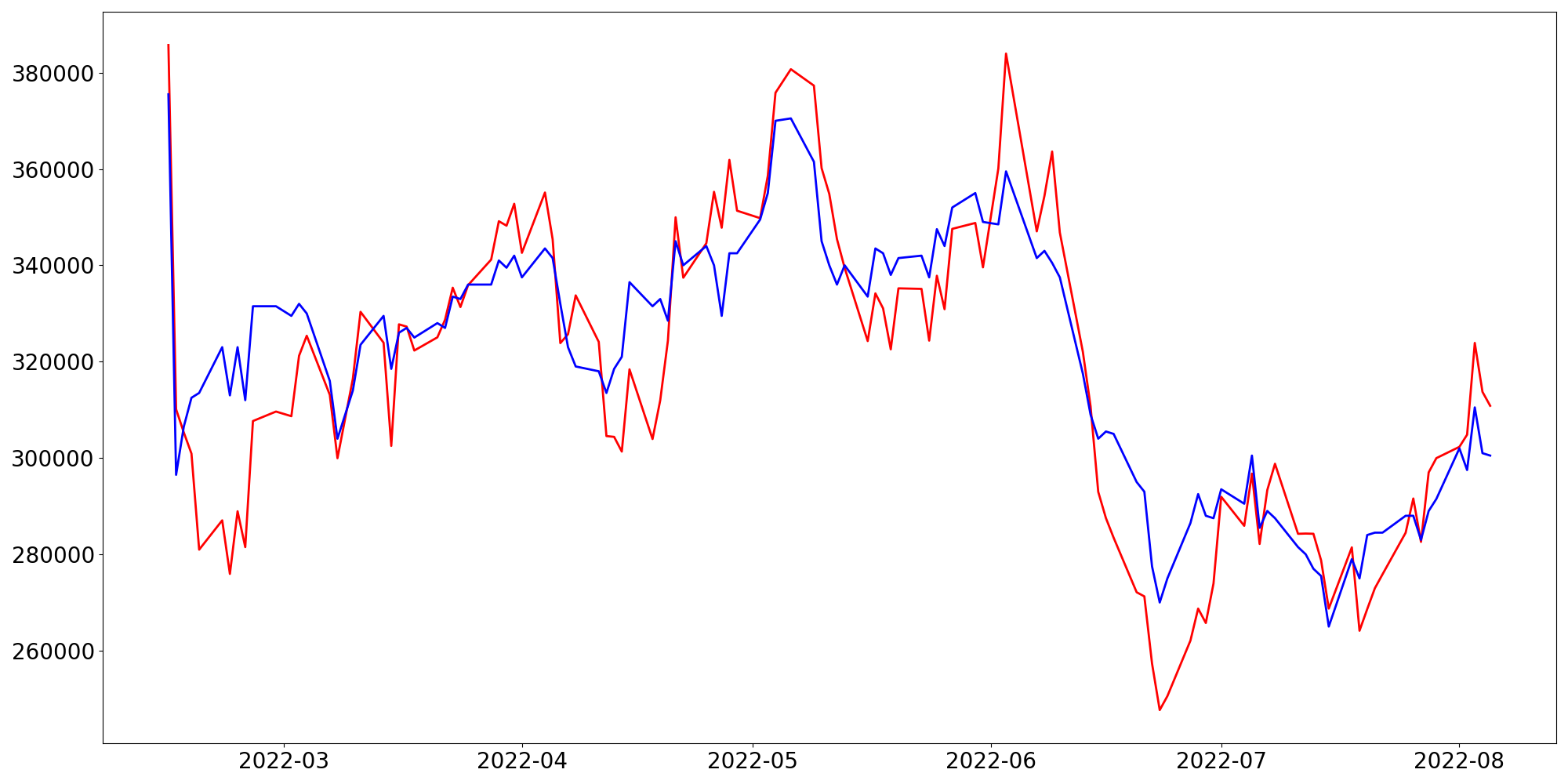 [ - : 실제값(종가) / - : 예측값(종가) ]