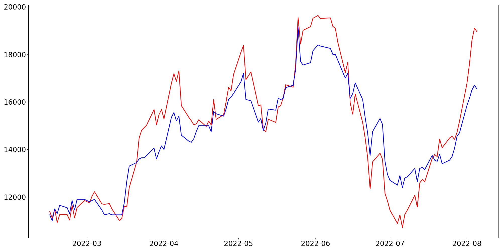 [ - : 실제값(종가) / - : 예측값(종가) ]