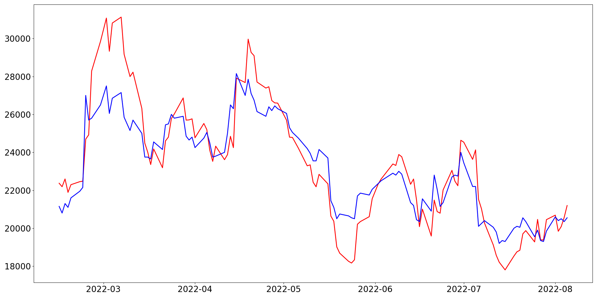 [ - : 실제값(종가) / - : 예측값(종가) ]