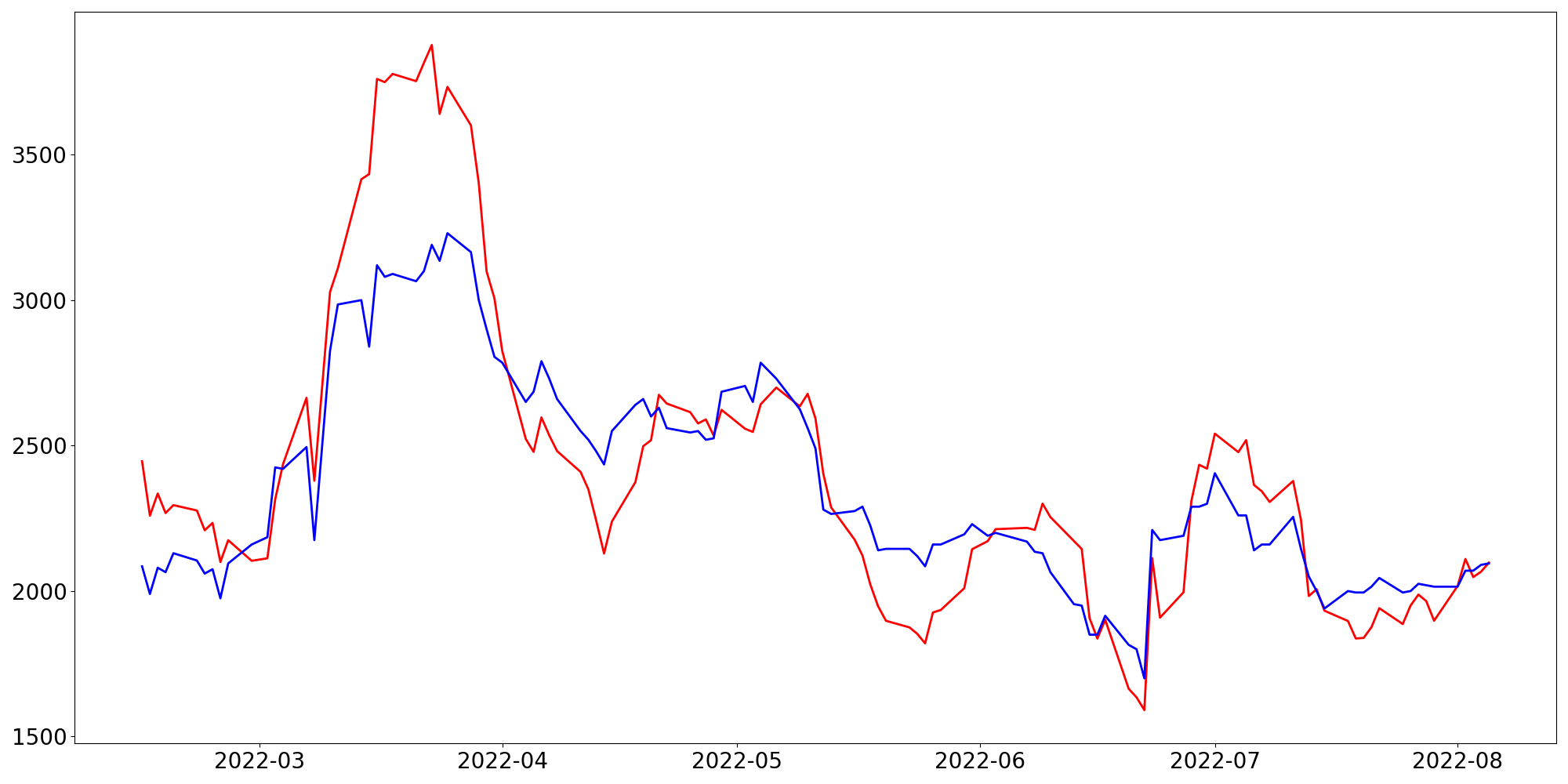 [ - : 실제값(종가) / - : 예측값(종가) ]
