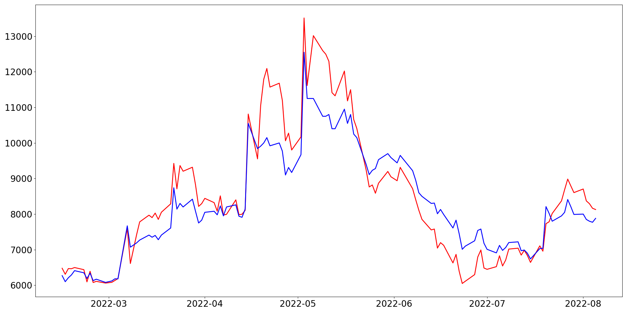 [ - : 실제값(종가) / - : 예측값(종가) ]