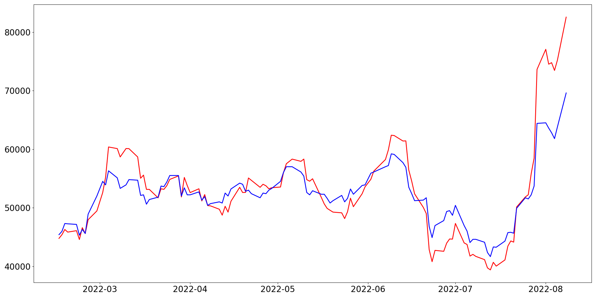 [ - : 실제값(종가) / - : 예측값(종가) ]