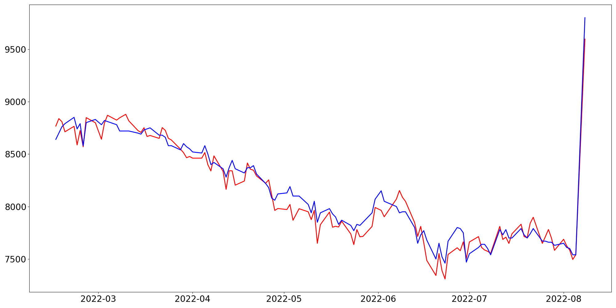 [ - : 실제값(종가) / - : 예측값(종가) ]