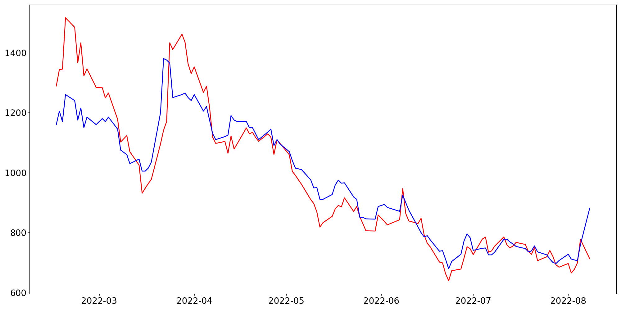 [ - : 실제값(종가) / - : 예측값(종가) ]