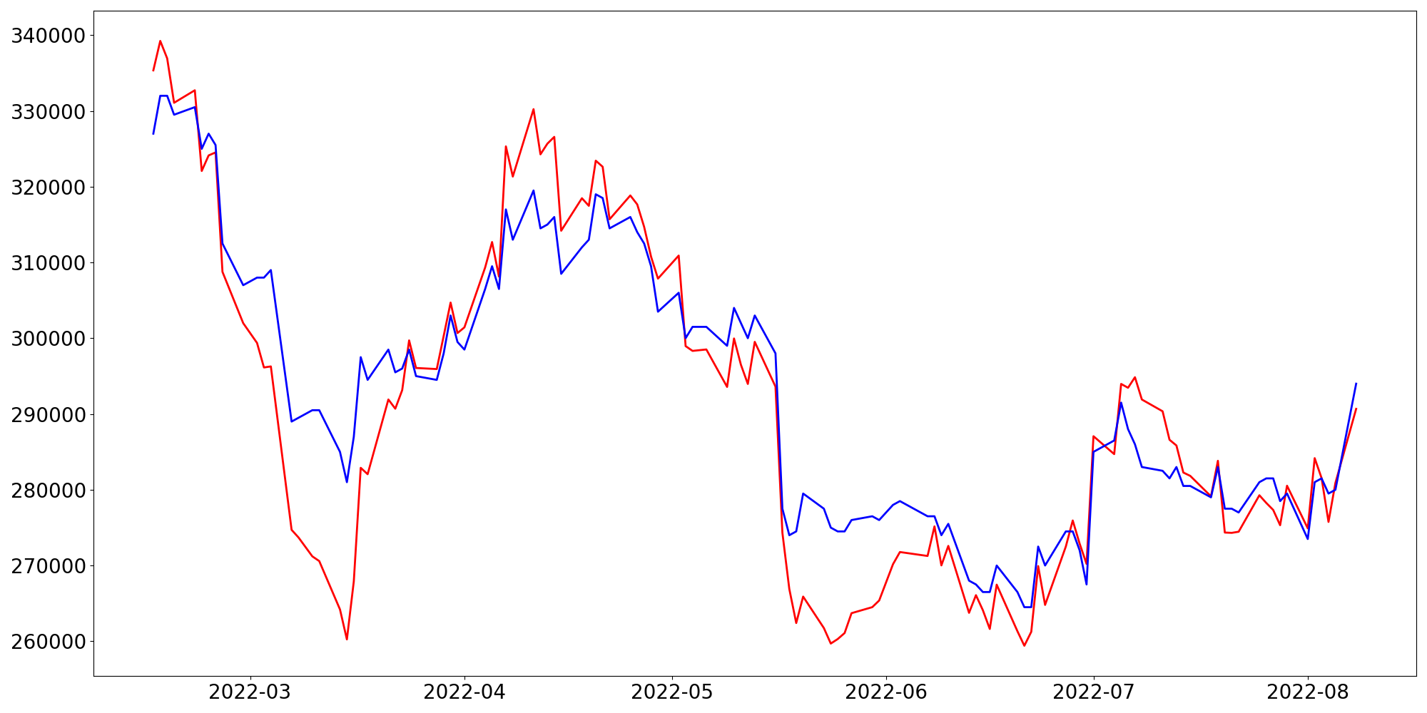 [ - : 실제값(종가) / - : 예측값(종가) ]