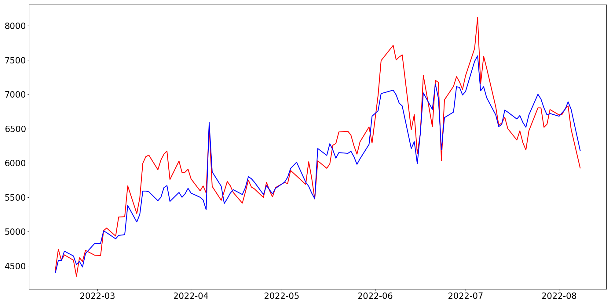 [ - : 실제값(종가) / - : 예측값(종가) ]