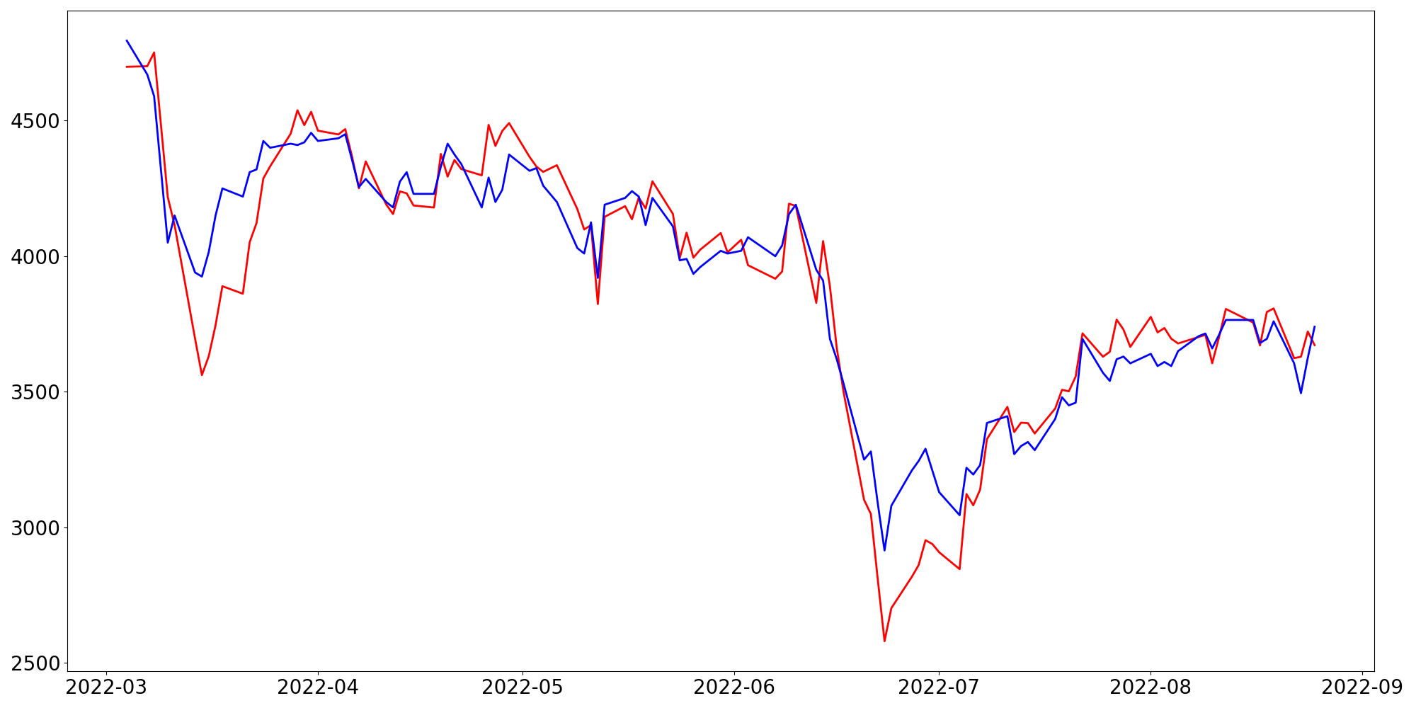 [ - : 실제값(종가) / - : 예측값(종가) ]