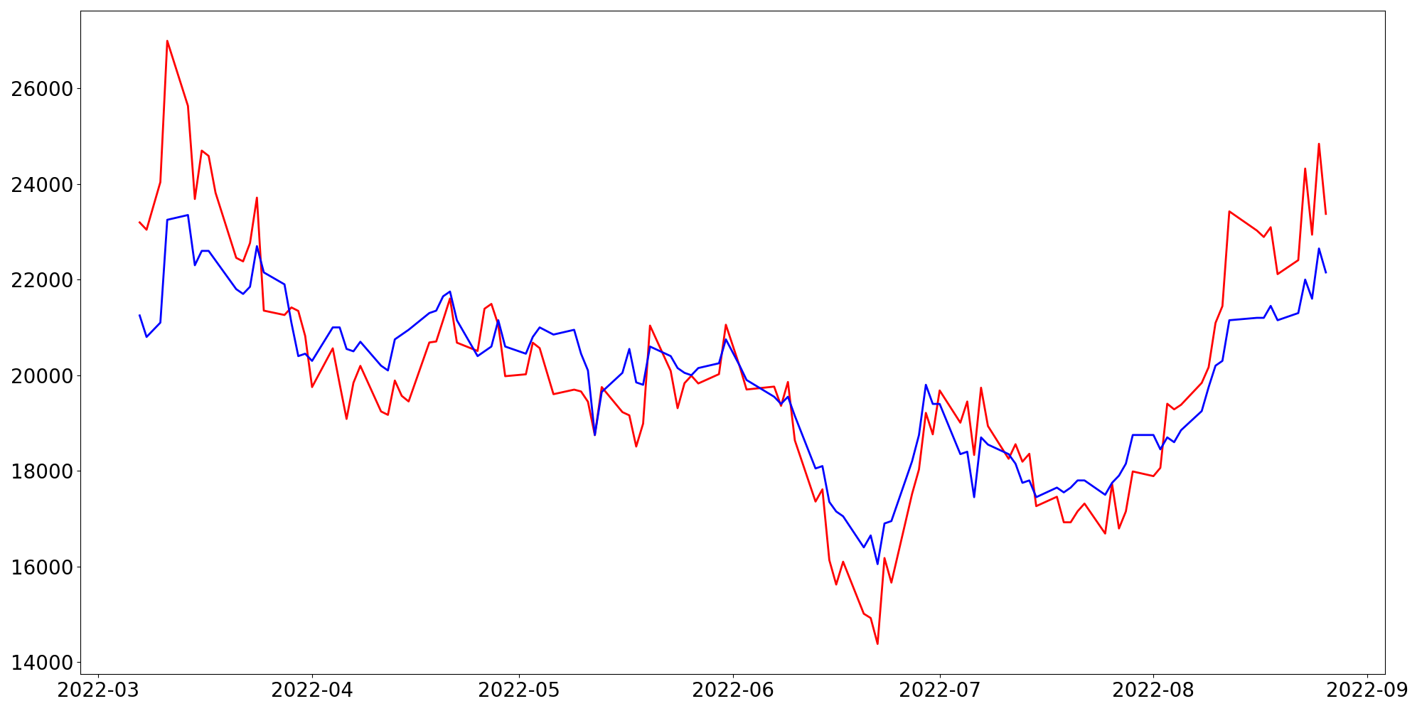 [ - : 실제값(종가) / - : 예측값(종가) ]